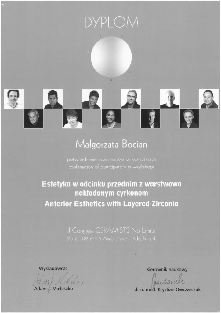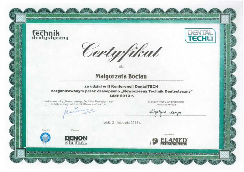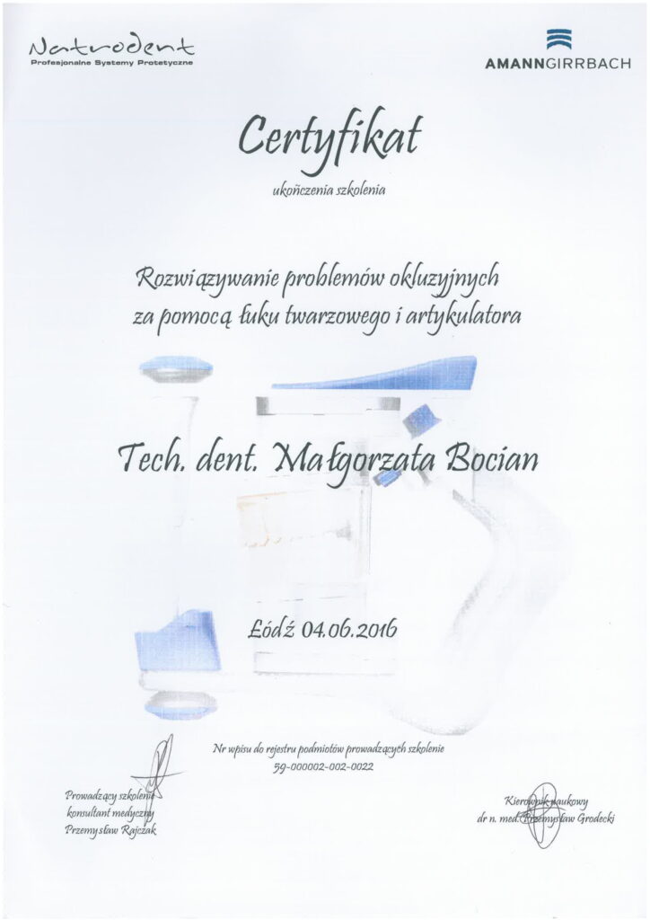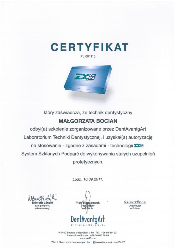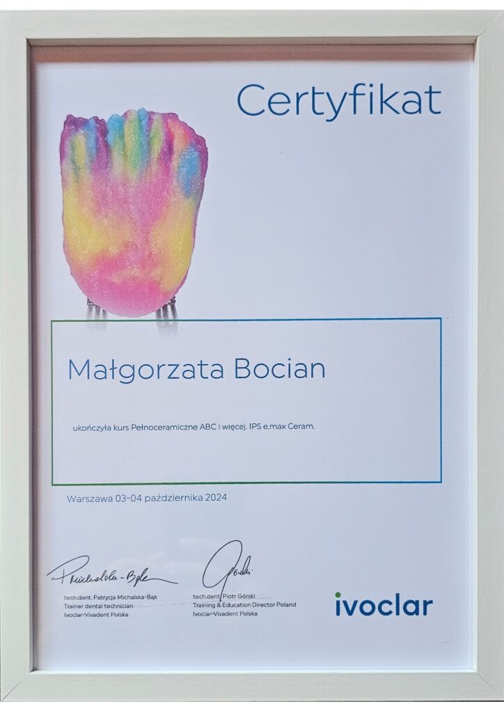 Nazywam się Małgorzata Bocian i od 30 lat prowadzę własną Pracownię Techniczno-Dentystyczną Małgorzata Bocian. Ukończyłam Studium Techniki Dentystycznej w Warszawie przy ul. Hożej – renomowanej placówki z wieloletnią tradycją, która dała mi podstawy mojej wiedzy i umiejętności.