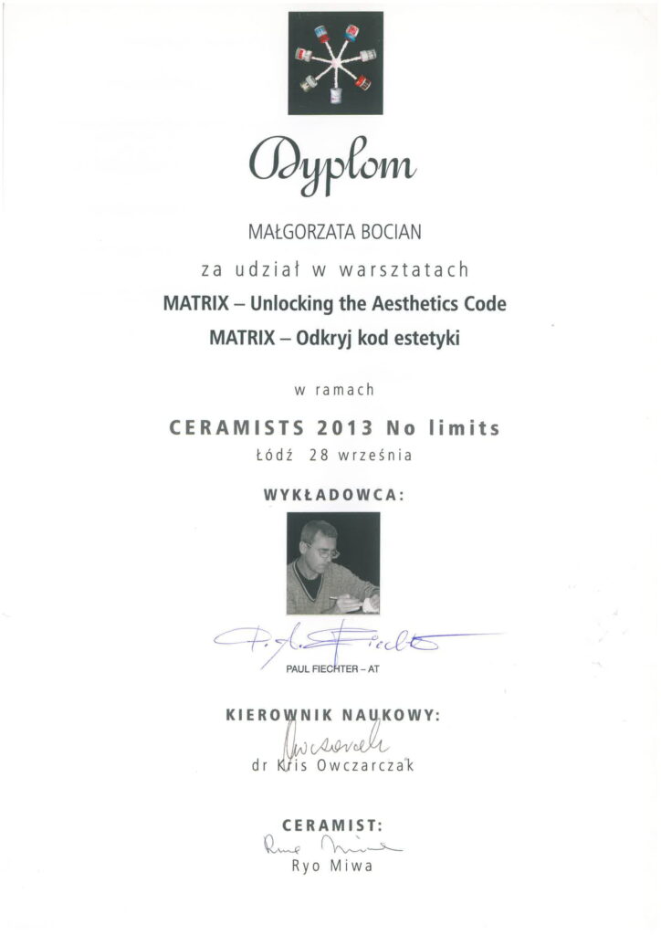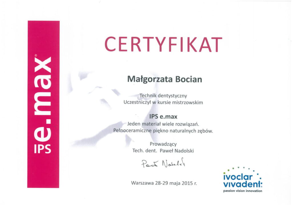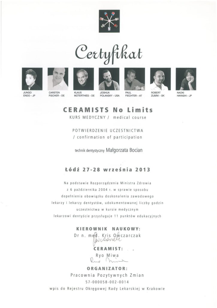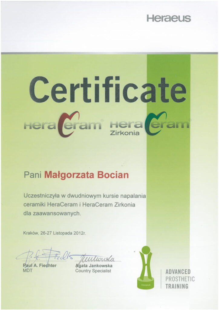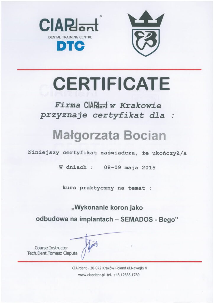 Nazywam się Małgorzata Bocian i od 30 lat prowadzę własną Pracownię Techniczno-Dentystyczną Małgorzata Bocian. Ukończyłam Studium Techniki Dentystycznej w Warszawie przy ul. Hożej – renomowanej placówki z wieloletnią tradycją, która dała mi podstawy mojej wiedzy i umiejętności.